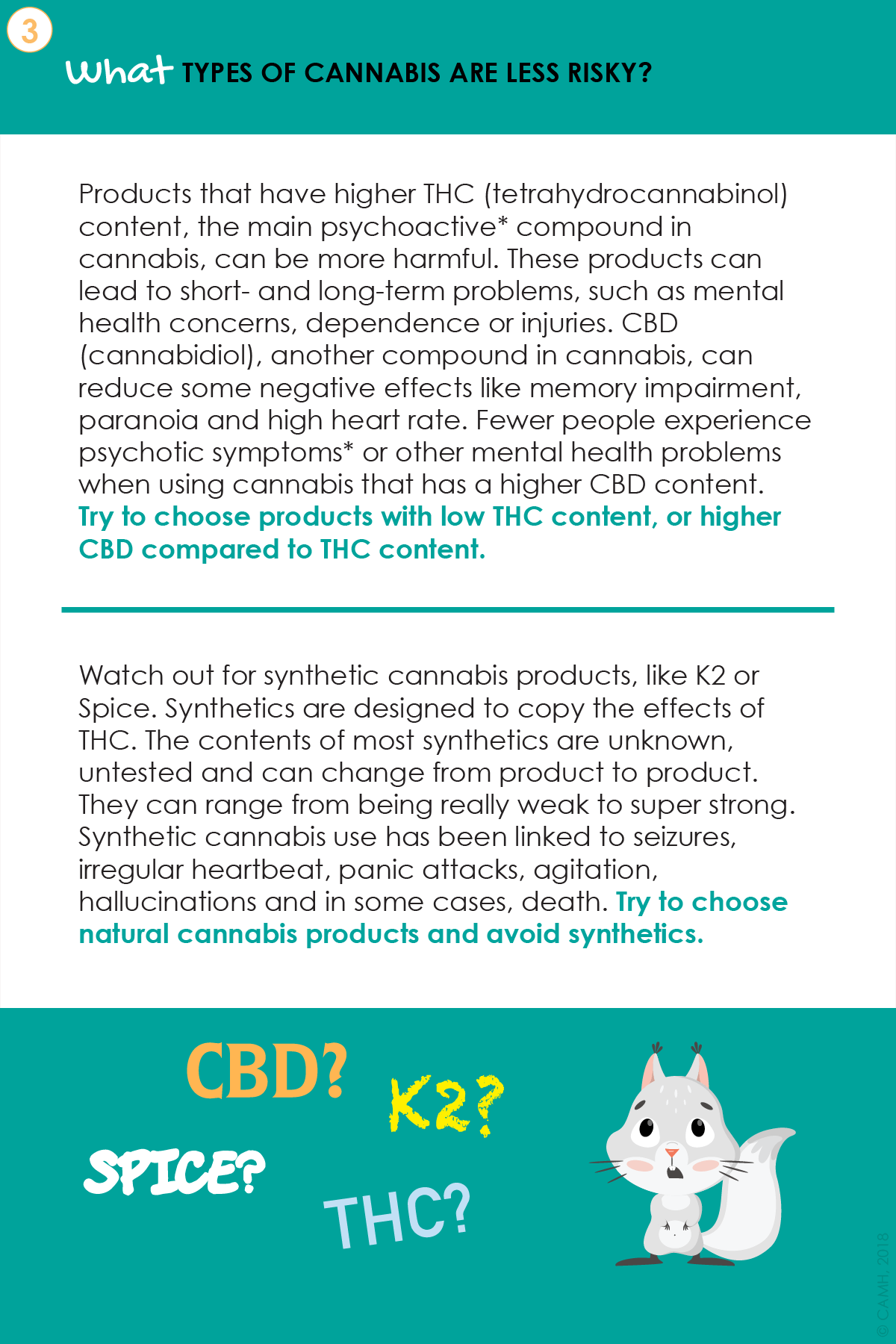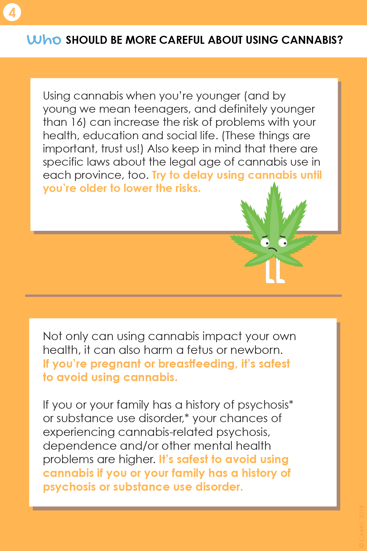 Cannabis is one of the most frequently used substances among young people. In fact, cannabis use is higher in this population than any other age group. This is why a youth version of Canada’s Lower-Risk Cannabis Use Guidelines (LRCUG) was developed for youth, by youth, in collaboration with CAMH’s Youth Engagement Initiative and National Youth Action Council (NYAC), and the Canadian Research Initiative in Substance Misuse (CRISM). This youth education resource provides information on safer ways to use cannabis using evidence-based recommendations. It may be also be a useful tool to start a conversation about cannabis use with young people across Canada.